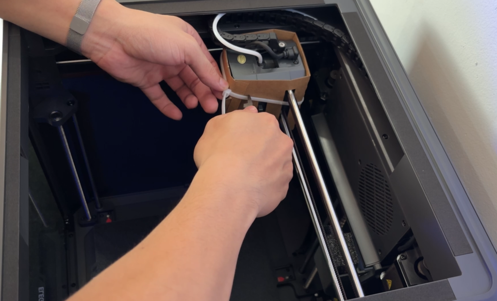 Before installing anything, I checked around the print head and noticed a small holding clip on the extruder. This clip is there to lock parts in place during shipping, and it definitely needs to be removed before turning the printer on. It’s a small detail, but if you miss it, the printer might not move smoothly during calibration. It’s one of those “simple but important” steps.