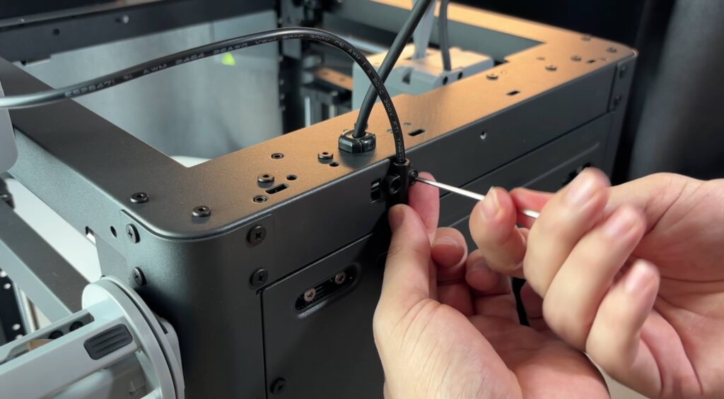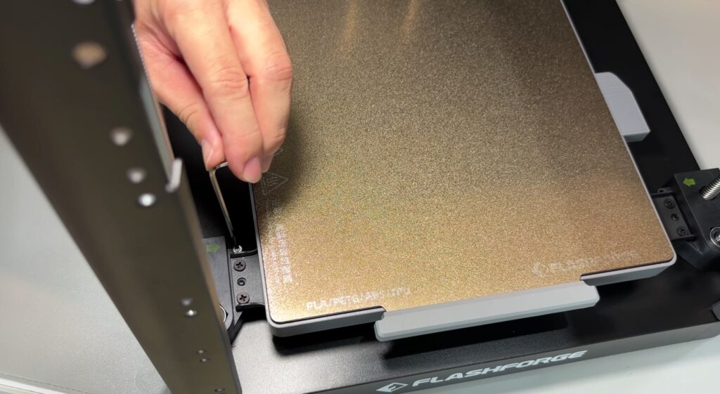 Before turning the printer on, don’t forget to remove the three shipping screws under the build plate. They are marked with arrow stickers and are easy to spot. Once powered on, the touchscreen walks you through the initial setup and calibration steps, making the first-time setup very beginner-friendly.