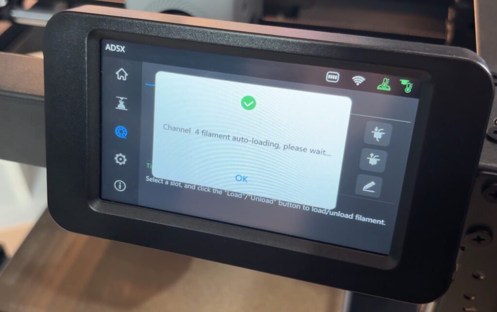 Loading filament on the AD5X is straightforward thanks to the IFS system. Each spool mounts on the side holder and feeds directly into the IFS through short Bowden tubes, keeping the path organized and reducing friction.